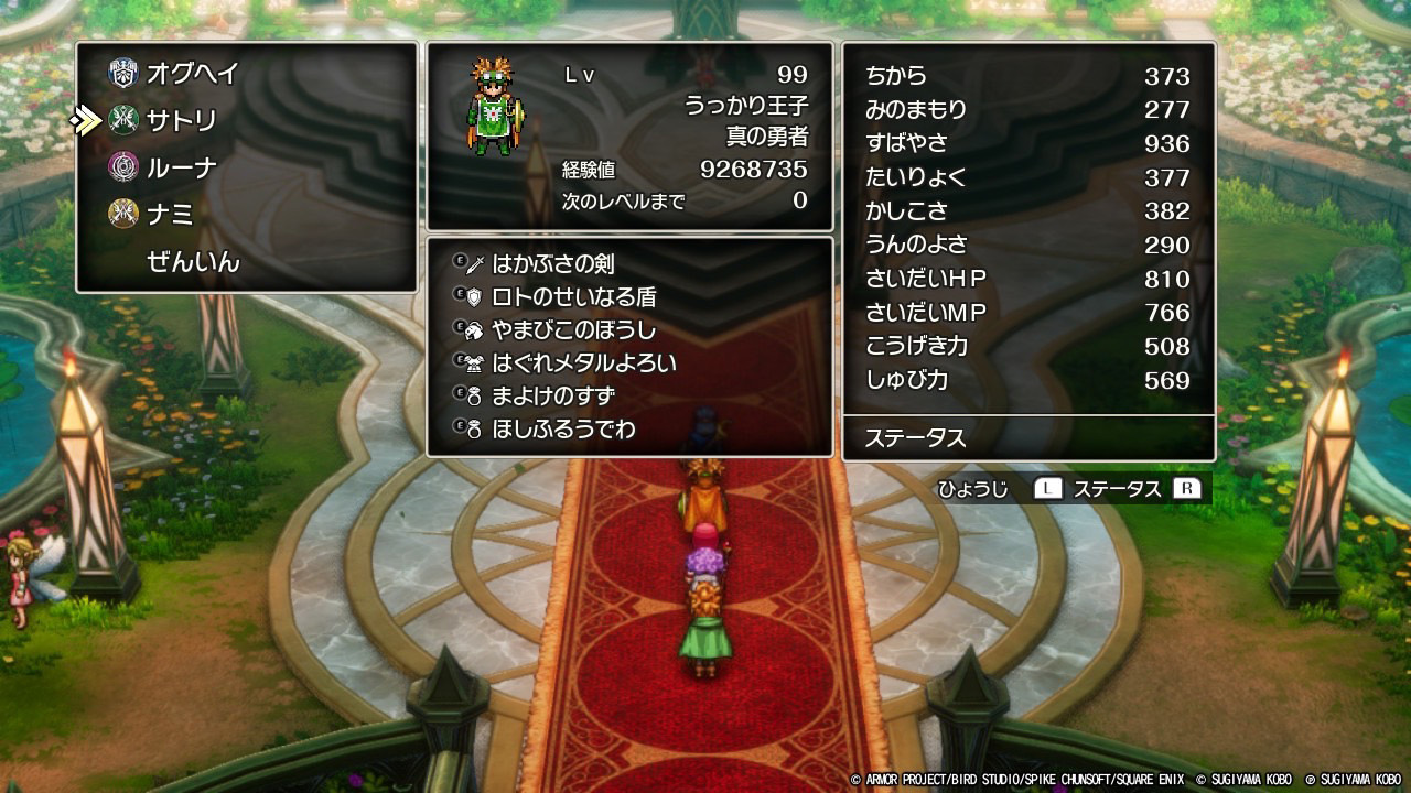 ただ、サマルトリアの王子が優遇されすぎて、ギガスラッシュ・はかぶさの剣装備はローレ、ベホマズンはムーンブルクが覚えたほうが良かったと思いますね。